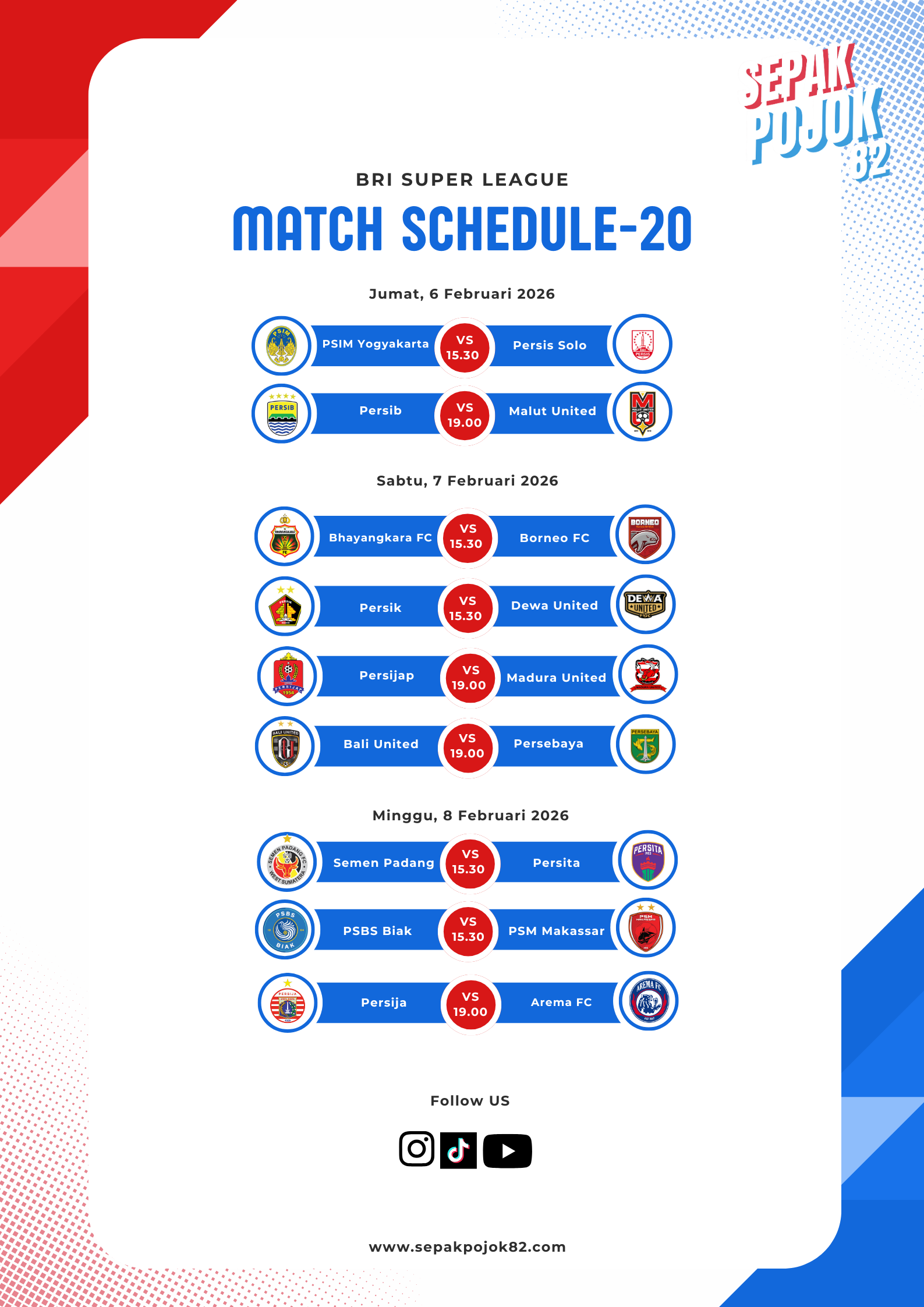 SEPAKPOJOK82.COM – Persaingan di BRI Super League 2025/2026 kembali memanas. Memasuki pekan ke-20, sejumlah laga krusial akan tersaji mulai Jumat, 6 Februari hingga Minggu, 8 Februari 2026. Duel tim papan atas hingga laga penentu nasib di klasemen bawah siap menyedot perhatian publik sepak bola nasional.